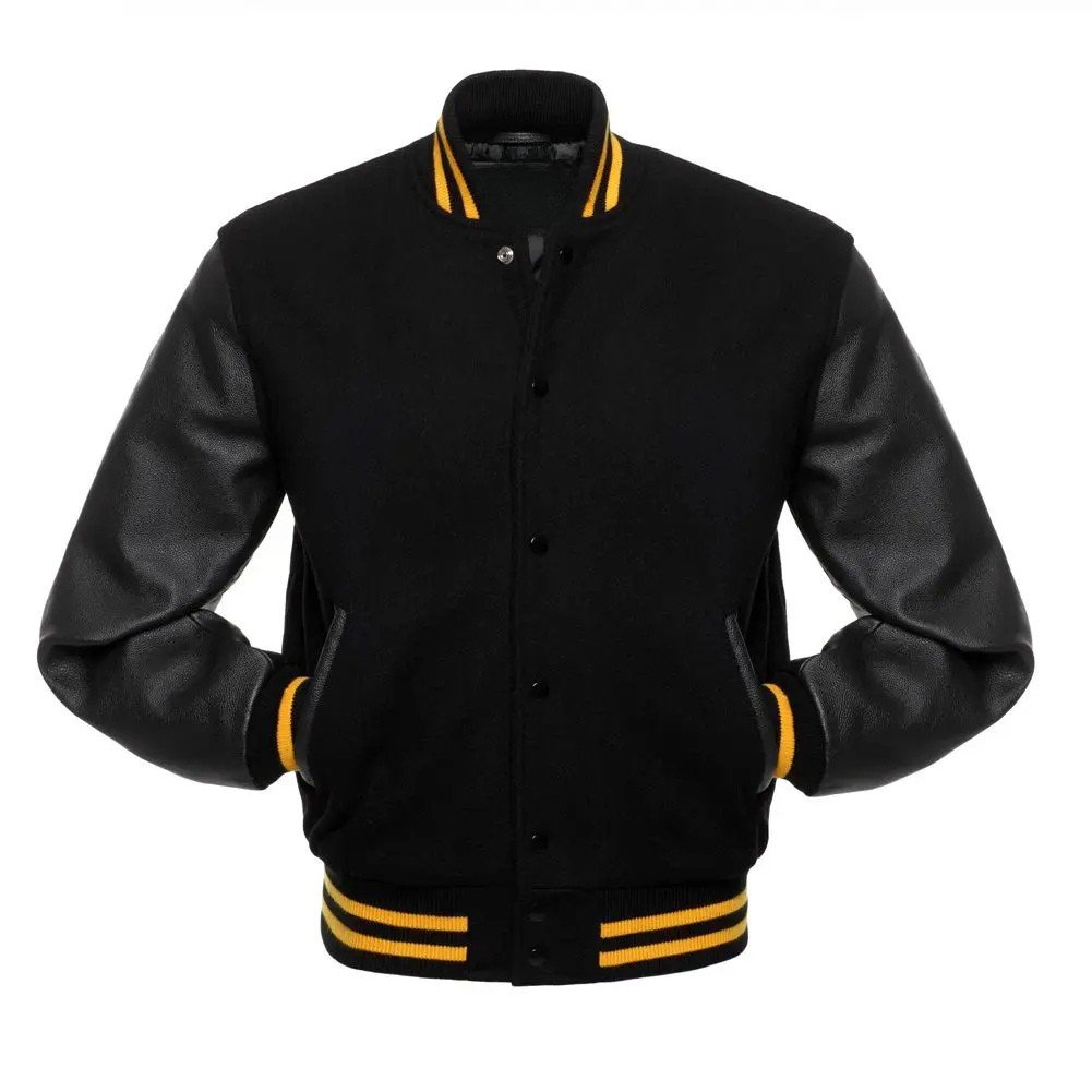 From sports teams to fashion enthusiasts, the Black Wool/Black Leather Varsity Jacket (Gold Trim) represents individuality, tradition, and effortless style a true modern take on an American original.