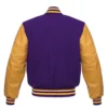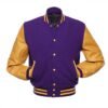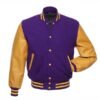 The Purple Wool/Gold Leather Varsity Jacket by Jacket Shoppe combines bold color with timeless American craftsmanship. Made from a durable 24 ounce purple wool body and premium gold cowhide leather sleeves, this jacket blends classic varsity style with modern-day appeal. Designed for warmth, comfort, and individuality, it’s a standout piece that never goes out of fashion.