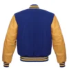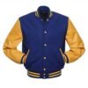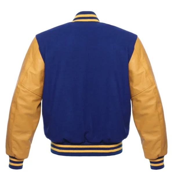 The Royal Wool/Gold Leather Varsity Jacket by Jacket Shoppe embodies the perfect mix of classic American varsity style and contemporary fashion. Expertly crafted from a 24 ounce royal blue wool body paired with luxurious gold cowhide leather sleeves, this jacket radiates confidence, quality, and timeless appeal.