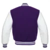 The iconic royal blue and white varsity jacket from Jacket Shoppe features a 24-ounce royal blue wool body paired with genuine white cowhide leather sleeves, offering the perfect blend of comfort, durability, and timeless American style.